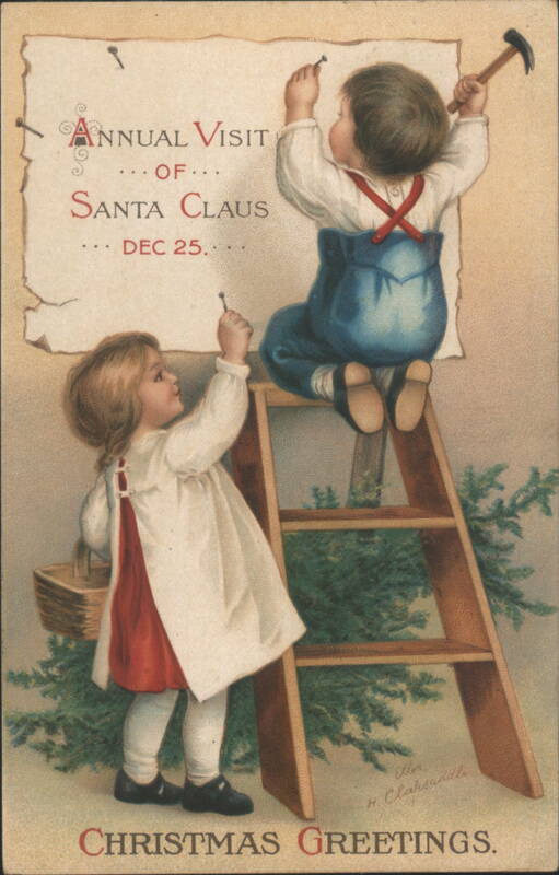 Children Nailing Santa Claus Visit Sign, Christmas Greetings by Clapsaddle