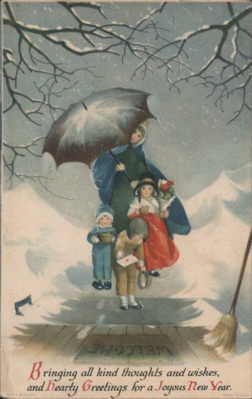 A snowy scene with a woman holding an umbrella over three children. The children are dressed in winter attire, one holding a bucket, another a letter, and the third a bouquet. Bare, snow-covered tree branches frame the top, and a 'WELCOME' mat and a broom are visible on a wooden porch. The card conveys 'all kind thoughts and wishes, and Hearty Greetings for a Joyous New Year. |