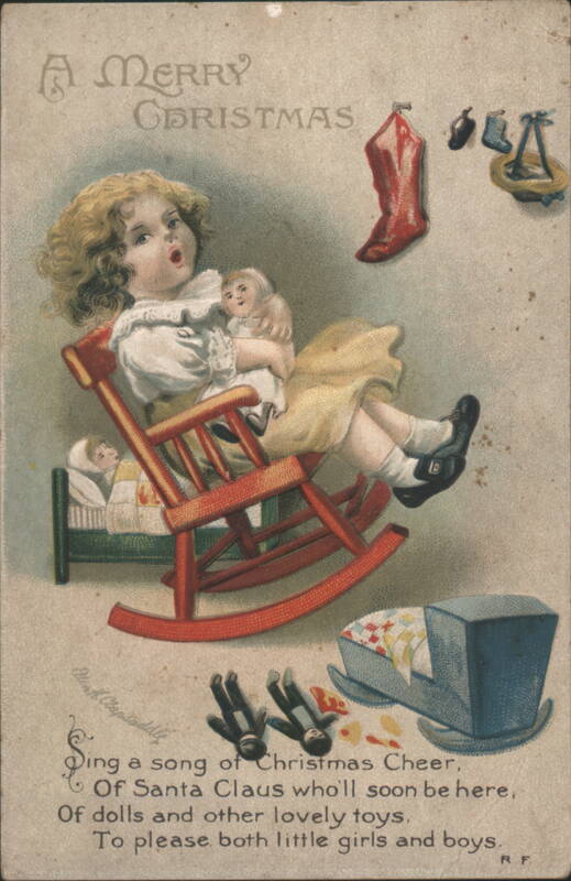 A young girl with curly hair sits in a red rocking chair, holding a baby doll. Another baby sleeps in a crib behind her. A red Christmas stocking hangs above, and various toys are scattered around. The card features a poem that reads: "Sing a song of Christmas Cheer, Of Santa Claus who'll soon be here, Of dolls and other lovely toys, To please both little girls and boys." |