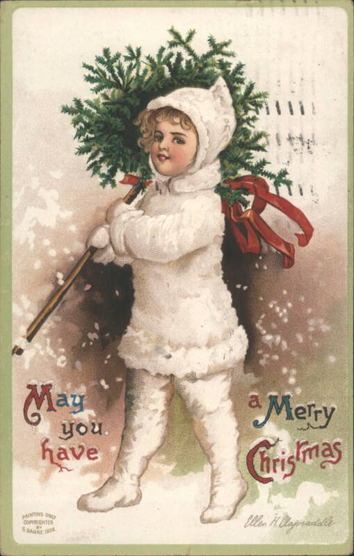 A young child, bundled in a white, fluffy winter suit with a hood, walks through a snowy landscape. They are carrying a large green evergreen wreath, adorned with red ribbons, over their shoulder with a stick. The card features the greeting "May you have a Merry Christmas." |