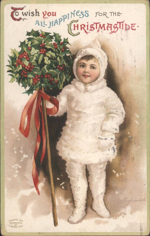 A young child, possibly a boy, dressed in a warm, white, hooded winter suit with fur trim, stands in a snowy landscape. The child holds a tall staff adorned with a large cluster of green holly leaves and bright red berries, tied with a flowing red ribbon. The text reads, 'To wish you ALL HAPPINESS FOR THE CHRISTMASTIDE. |