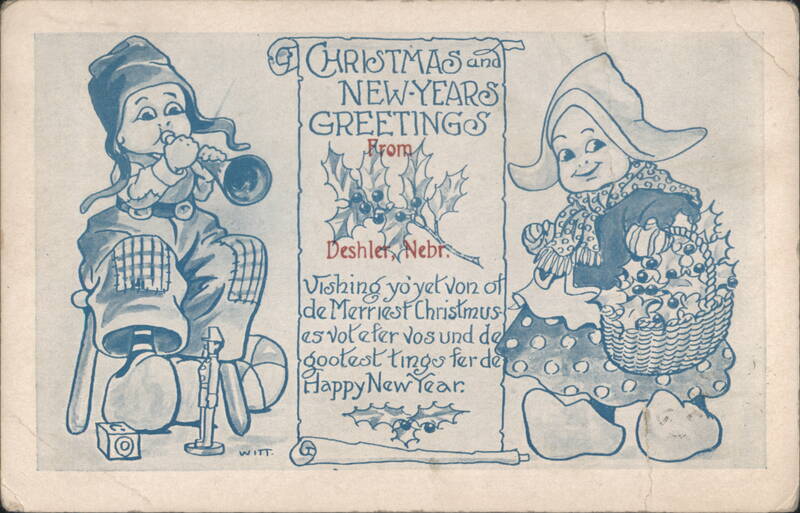 Christmas & New Year's Greetings, Children Playing Horn & Basket, Deshler NE