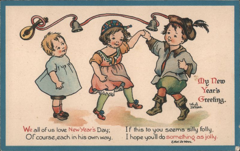 An illustration depicting three children in period attire, two boys and one girl, dancing joyfully. Bells are strung on a ribbon above them, and a stringed instrument hangs on the left. The card features a New Year's poem.