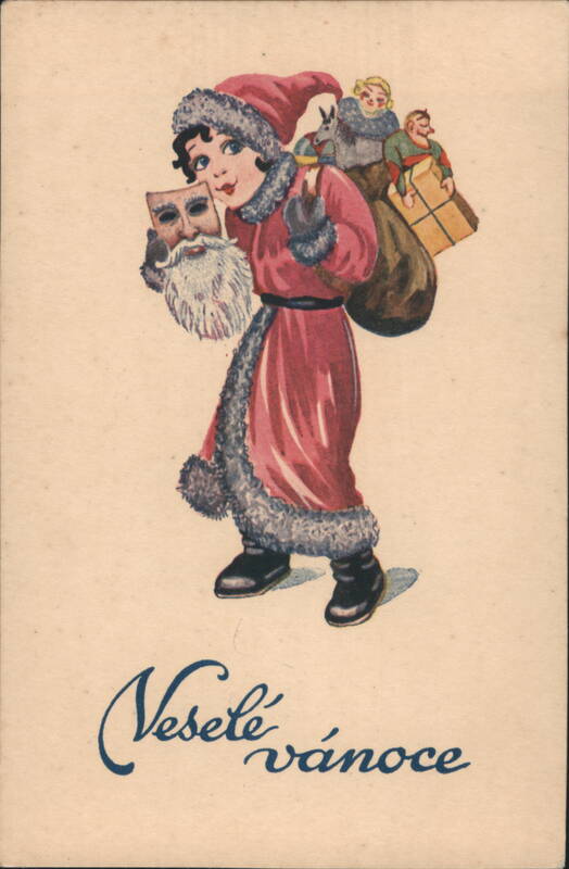 An illustration of a young person in a red Santa suit with fur trim, holding a Santa mask with a white beard, revealing their face. A large sack on their back contains small figures, possibly toys or elves. The greeting 'Veselé vánoce' (Merry Christmas) is written in script at the bottom. |