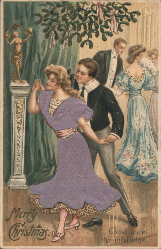 An illustrated scene depicting a couple dancing at a Christmas party, with the man leading the woman in a purple dress under a sprig of mistletoe. Other partygoers are visible in the background, including a woman in a blue dress. A classical statue on a pedestal stands to the left. The card features the greeting 'Merry Christmas' and the phrase 'Come under the mistletoe.