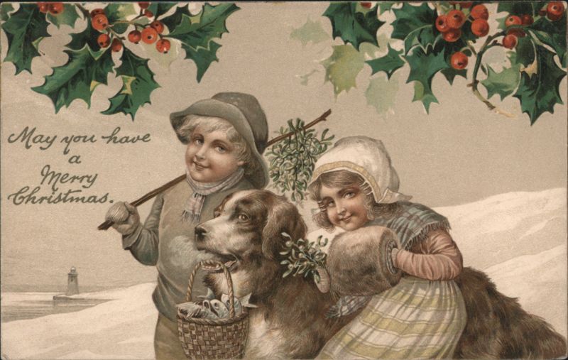 | A boy and a girl, dressed in winter attire, stand with a large dog in a snowy landscape. The boy carries a branch of mistletoe over his shoulder, while the girl holds a fur muff. The dog holds a small basket filled with fish in its mouth. Holly with red berries frames the top of the scene, and a lighthouse is visible in the distant background. The card bears a Christmas greeting. |