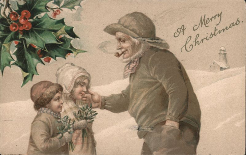 The front depicts an elderly man, possibly Santa Claus or a kindly figure, wearing a hat and a scarf, smoking a pipe, and smiling at a young girl. The girl, dressed in a hooded cloak, is holding a sprig of mistletoe, while a younger boy stands beside her, also holding mistletoe. Lush green holly with bright red berries frames the upper left corner. The scene is set in a snowy landscape with a small, steeple-like building visible in the distance. The greeting "A Merry Christmas." is written in script in the upper right. |
