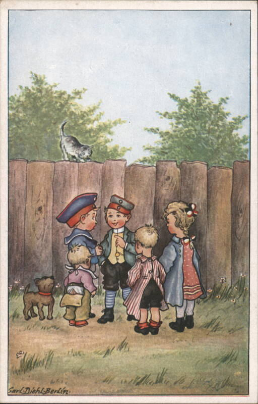 An illustration depicting five children (three boys and two girls) gathered around a wooden fence. A small brown dog stands near the fence on the left, while a grey cat perches atop the fence, looking down at the children. The children are dressed in early 20th-century attire, with two boys wearing military-style caps and jackets. Trees are visible in the background. |