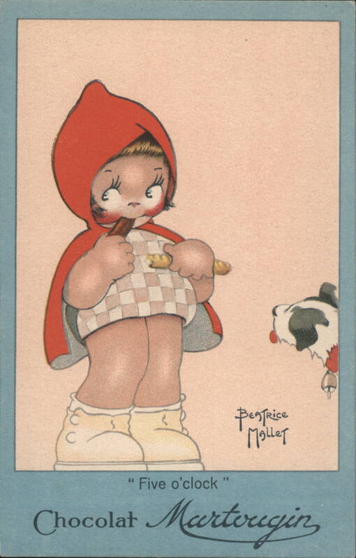 A charming illustration of a wide-eyed young girl in a red hooded cape and a checkered dress, holding and eating two bars of Martougin chocolate. A small black and white dog with a bell on its collar peeks from the side, looking longingly at the chocolate. The scene is titled "Five o'clock".