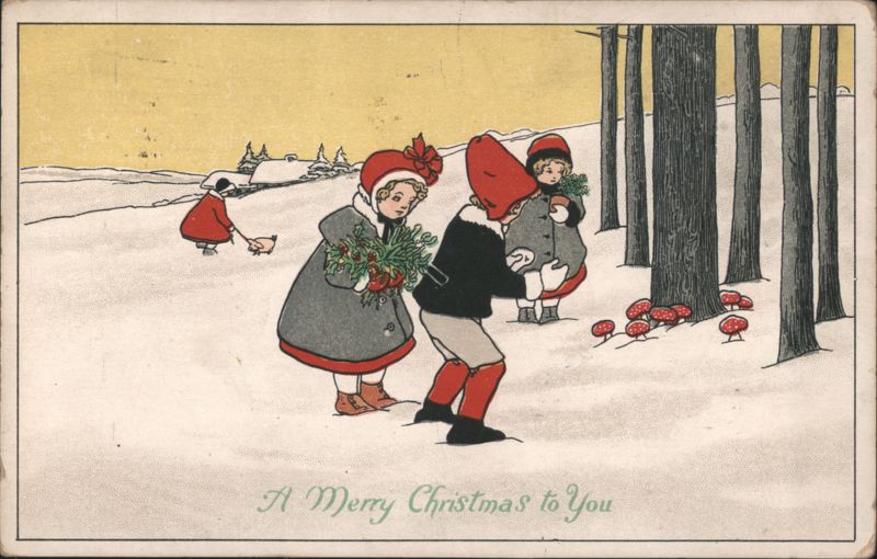An illustrated scene of three children in a snowy winter landscape. Two children in the foreground are dressed in winter coats and hats, carrying bundles of evergreens. A third child is in the background, pulling a small sled. Bare trees and red mushrooms are visible on the right, with distant houses. The card includes the greeting "A Merry Christmas to You." |