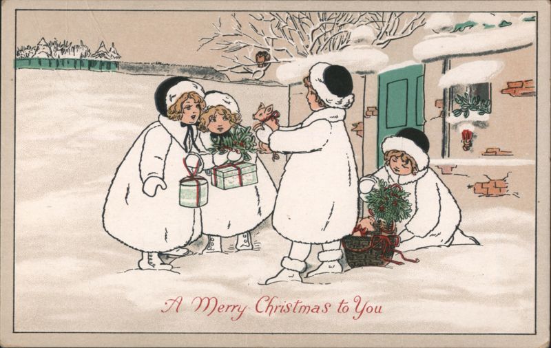 Four children dressed in white winter coats and hats stand in a snowy landscape. One child holds a basket with mistletoe, another holds a wrapped gift, and a third holds a small bucket. A snow-covered house and bare trees are in the background. The card wishes 'A Merry Christmas to You. |
