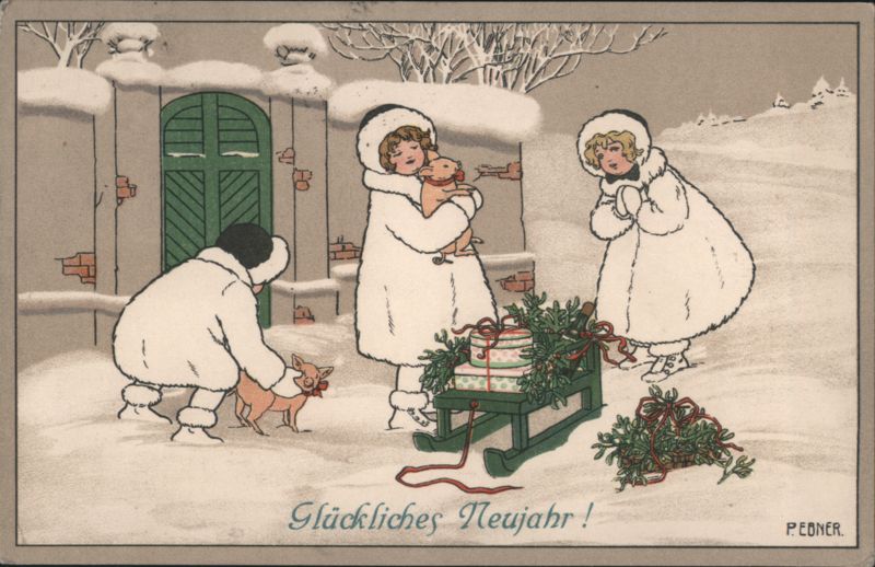 Three children bundled in winter coats play in the snow. One child holds a small pig, while another pig stands nearby. A sled laden with wrapped gifts sits beside them, near a building with a green door. The scene is set against a snowy landscape with bare trees, wishing a 'Happy New Year! |