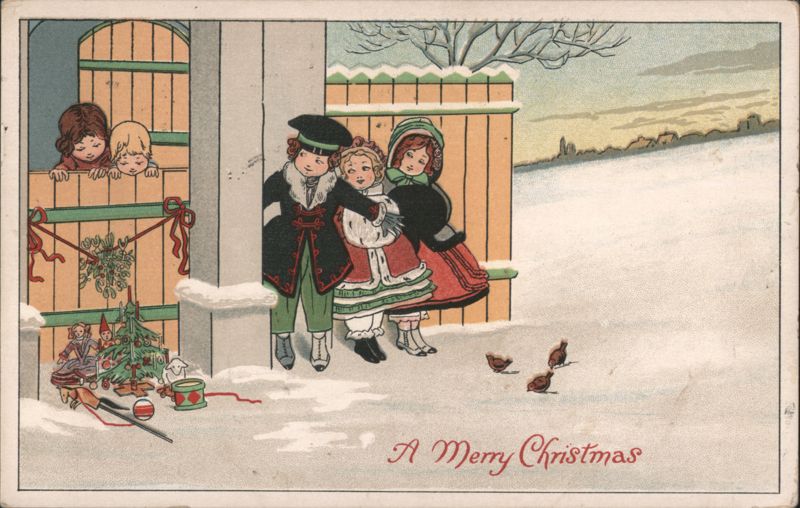 | An illustration of children celebrating Christmas in a snowy landscape. Two boys and two girls are featured, with two girls peeking from a doorway adorned with mistletoe. In the foreground, a boy embraces a girl, while another boy holds a girl's hand. A small decorated Christmas tree, a drum, and a horn are on the snow, along with three birds. The sky is a wintery blue with a bare tree. |