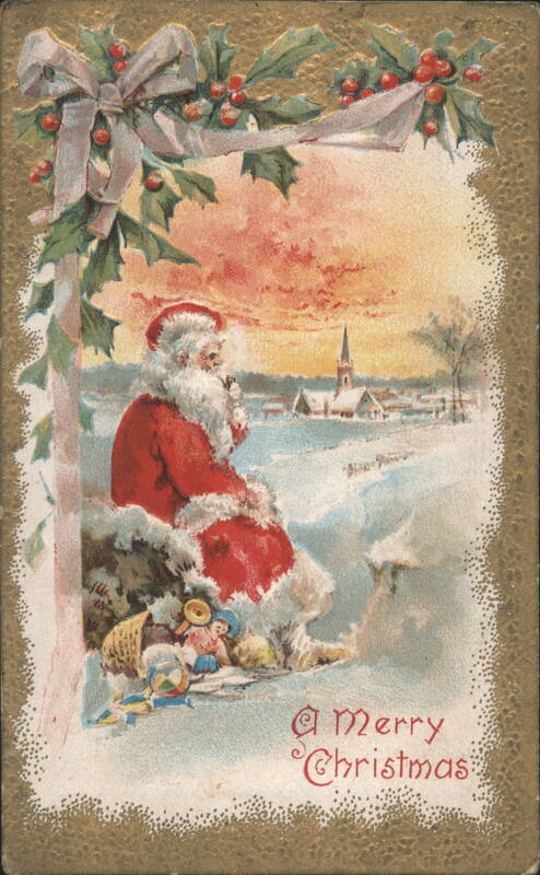 | A colorful illustration of Santa Claus in a red suit with white fur trim, sitting in a snowy landscape. He holds a pipe and is surrounded by a basket of toys including a drum, horn, and doll. In the background, a snow-covered village with a church steeple is visible under a vibrant sunset sky. The scene is framed by holly and berries with a pink bow on the left. |