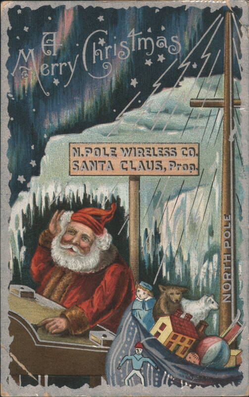 Santa Claus, proprietor of the North Pole Wireless Co., sits at a desk with a telegraph key, surrounded by ice formations and the aurora borealis. A small child, a bear, a sheep, and a miniature village with toys are also depicted.