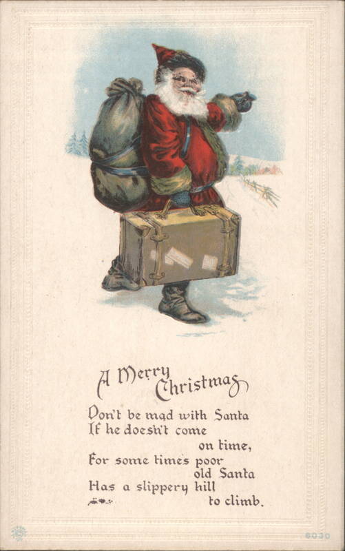 An illustration of Santa Claus, dressed in his traditional red suit and white beard, trudging through a snowy landscape. He carries a large sack of toys over one shoulder and a brown suitcase in his other hand. The card features the verse: 'Don't be mad with Santa If he doesn't come on time, For some time's poor old Santa Has a slippery hill to climb.' A 'Merry Christmas' greeting is also present. The reverse side includes a handwritten message. |
