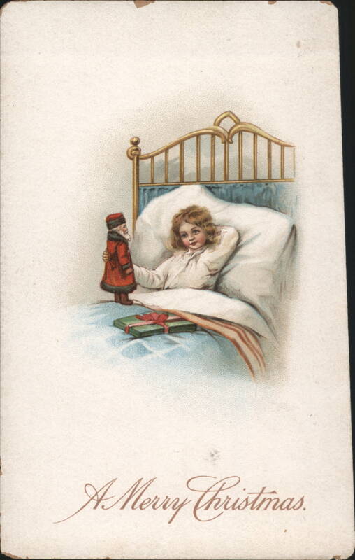 Child in Bed with Santa Doll & Christmas Gift, "A Merry Christmas" Greeting