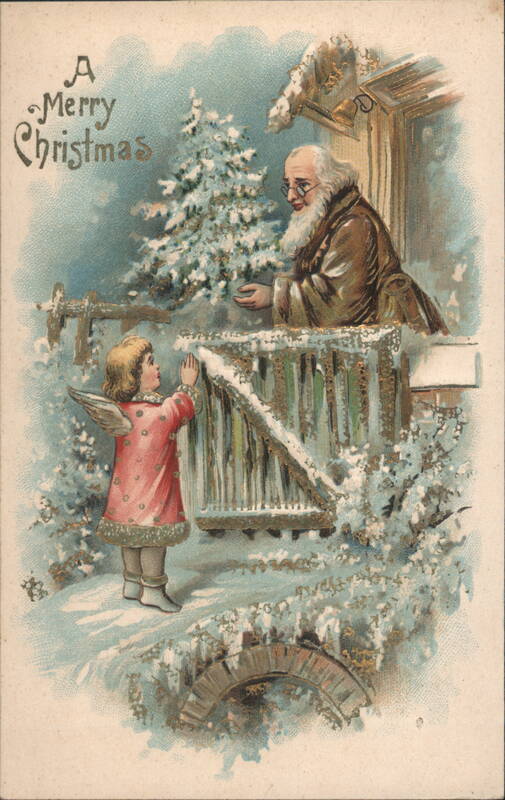 Merry Christmas Angel Child and Old Man in Snowy Winter Scene