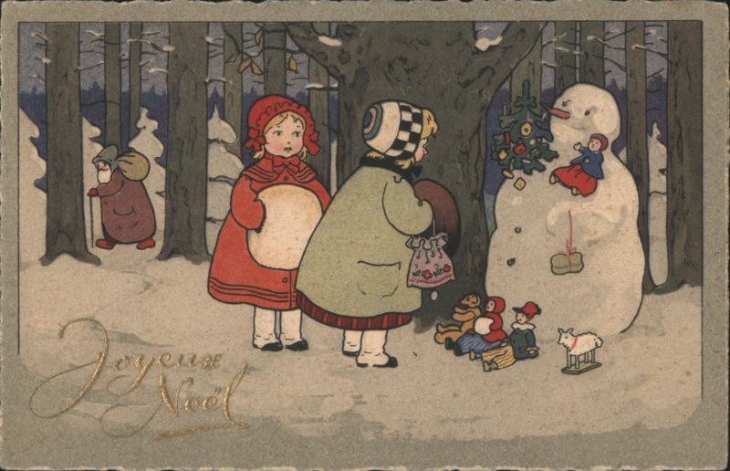 Two children, one in a red coat and the other in a green coat and checkered hat, admire a snowman adorned with a miniature Christmas tree and a doll. Various toys, including a rocking horse and a toy sheep, are placed near the snowman. A figure carrying a sack walks through the snow-covered trees in the background. |