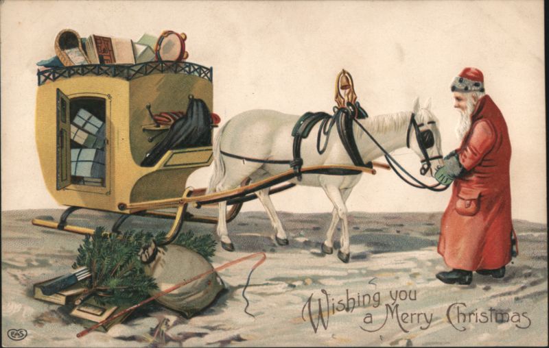 Santa Claus with White Horse and Sleigh Full of Presents, Wishing a Merry Christmas