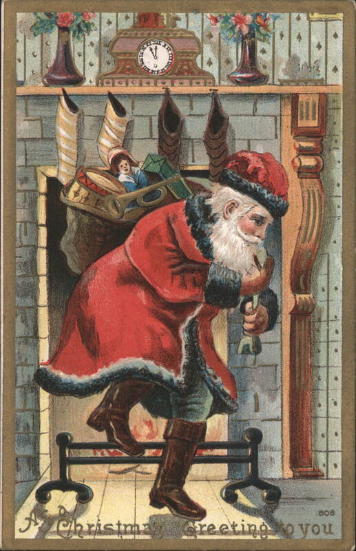 An illustration of Santa Claus in his traditional red and white suit, emerging from a brick fireplace with a large sack filled with toys, including a doll. The mantelpiece above features decorative vases with flowers and a clock, with several stockings hanging. The bottom of the card reads 'A Christmas greeting to you'. |