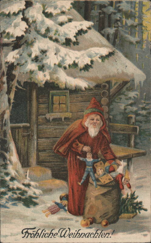| A festive scene depicting Santa Claus, dressed in a red robe and hat, standing in a snowy forest next to a rustic log cabin. He holds a small doll and pulls a large sack filled with various toys, including more dolls and a miniature Christmas tree. The ground and pine trees are covered in snow, creating a winter wonderland setting. The German greeting "Fröhliche Weihnachten!" (Merry Christmas!) is printed at the bottom. |