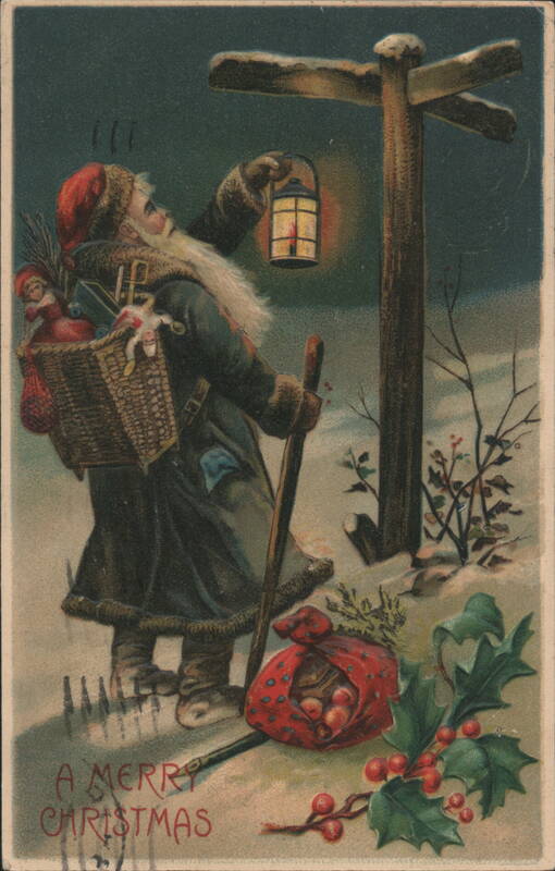 A traditional Santa Claus figure, with a long white beard and red cap, walks through a snow-covered landscape at dusk or night. He holds a lit lantern in one hand and carries a large woven basket filled with toys and gifts on his back. A wooden signpost stands to his right. In the foreground, a red sack overflowing with gifts and a sprig of holly with red berries are visible. The overall scene conveys a festive, wintry Christmas theme. |