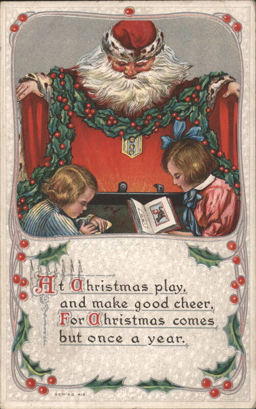 | An illustration featuring a large depiction of Santa Claus in a red suit with a white beard, surrounded by a garland of holly and red berries. Below him, two young children, a boy and a girl, are seated at a table, engrossed in reading a Christmas book. The girl wears a pink dress and blue bow, and the boy wears a striped shirt. The card includes a festive verse: "At a Christmas play, and make good cheer, For Christmas comes but once a year." |