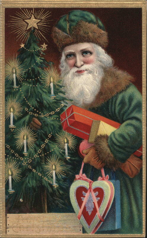 An illustration of Santa Claus, depicted with a long white beard, blue eyes, and wearing a green fur-trimmed coat and hat. He holds a stack of wrapped gifts and a heart-shaped bag. Beside him stands a Christmas tree adorned with lit candles, a string of ornaments, and a star on top. |