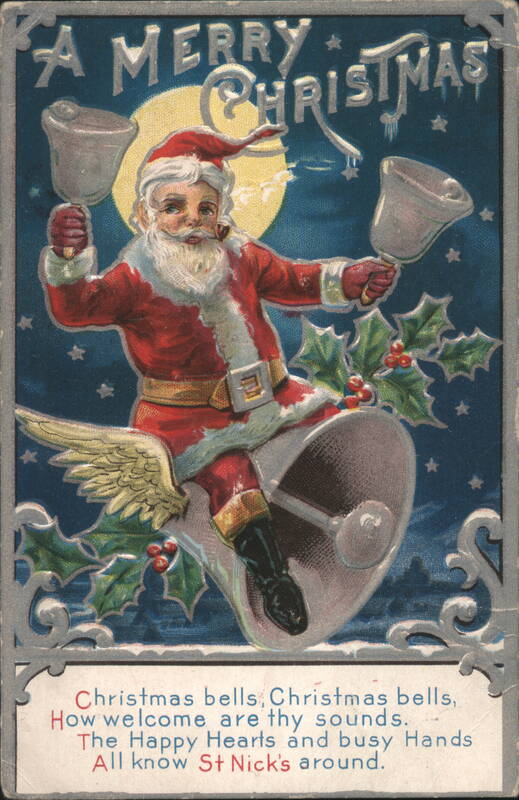 | An illustration of Santa Claus in his traditional red suit, white beard, and boots, flying through a starry night sky. He is seated on a large, ornate silver bell with wings, holding a smaller silver bell in each hand. A bright full moon is visible in the background, and sprigs of green holly with red berries frame the scene. The top of the card reads "A MERRY CHRISTMAS" and a poem is printed at the bottom. |