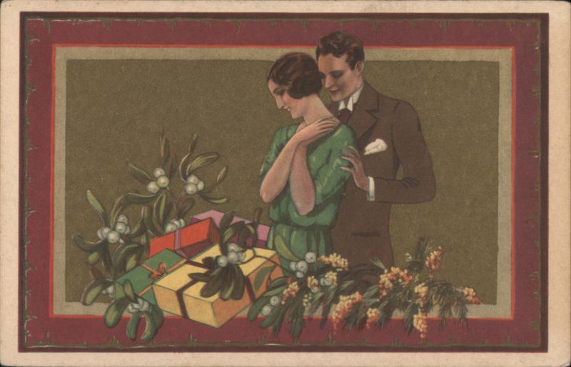 Couple with Gifts, Mistletoe & Flowers, Italian Art Deco Style