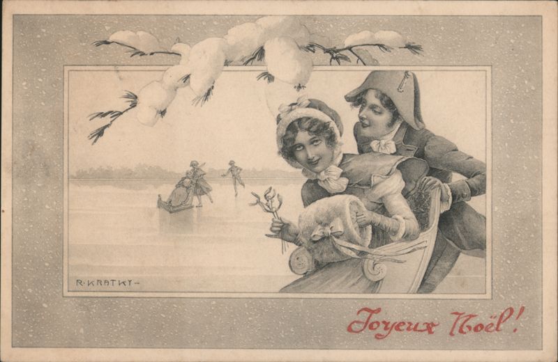 Joyeux Noël! Ice Skating Couple in Sleigh, Winter Scene by R. Kratky