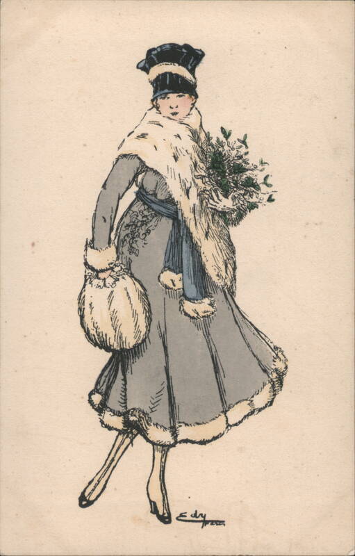 An elegant illustration of a woman dressed in a fashionable early 20th-century winter ensemble. She wears a long grey coat with white fur trim, a matching fur stole, and a fur muff. A dark, stylish hat completes her look, and she carries a bouquet of green foliage. Signed by artist Edry. |