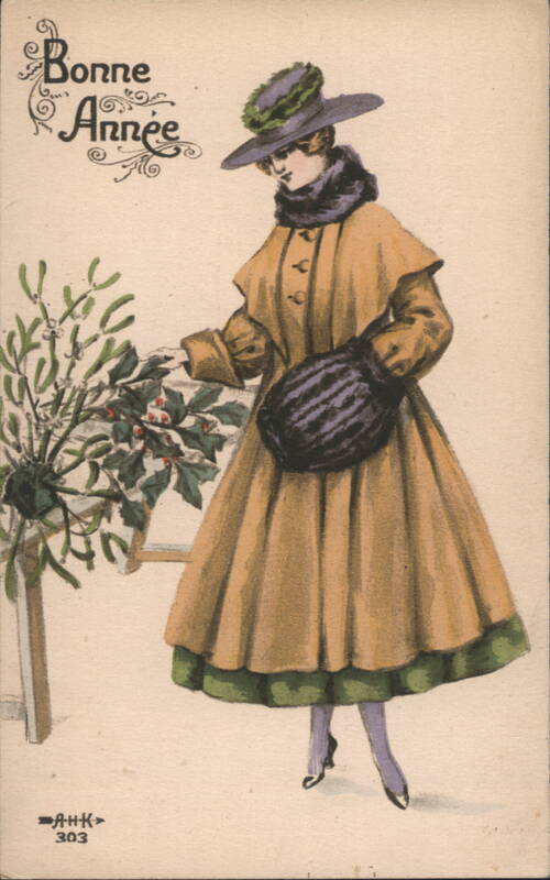 Bonne Année Woman in Mustard Coat & Purple Hat with Mistletoe