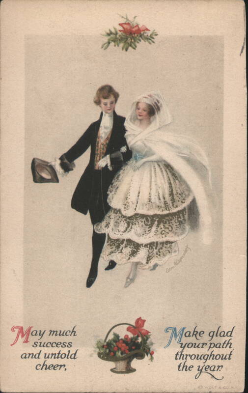 An illustrated scene of a man in a black suit and top hat with a woman in a white tiered lace dress and veil, walking together. Festive holly and berries adorn the top and bottom of the card, accompanied by New Year's greetings.
