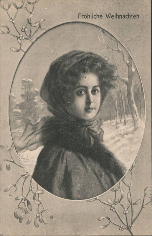 A sepia-toned image of a young woman with dark, curly hair, wearing a headscarf and a fur-trimmed coat. She is framed by an oval vignette with a snowy forest background. Mistletoe sprigs adorn the corners of the card. The German greeting 'Fröhliche Weihnachten' is at the top.