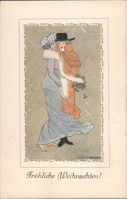 | An Art Nouveau illustration featuring two women in winter attire, with snow falling. One woman, wearing a hat and a fur-trimmed coat, embraces the other, who wears a hat and a long coat, holding a sprig of mistletoe. The text 'Fröhliche Weihnachten!' (Merry Christmas!) is at the bottom. |