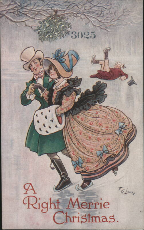 A Right Merrie Christmas: Ice Skating Couple and Fallen Skater with Mistletoe