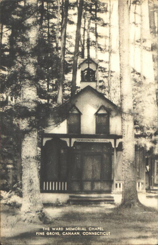 A charming chapel with a bell tower, nestled among tall trees. The architecture features a gabled roof and a prominent entrance with a decorative facade.