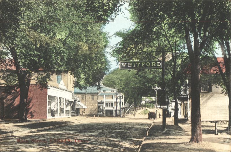 A tree-lined street scene with various buildings, some brick, some wood, and a prominent street sign pointing to "WHITFORD".