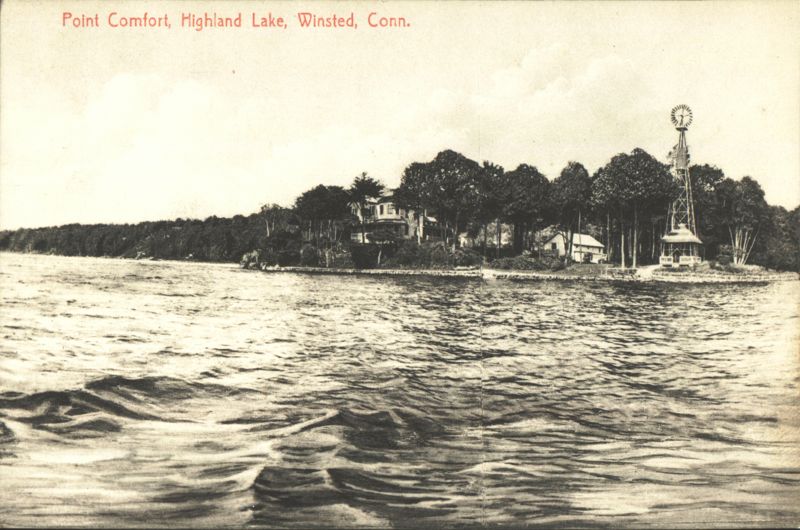 View of the lake with the shoreline featuring buildings and a prominent windmill.