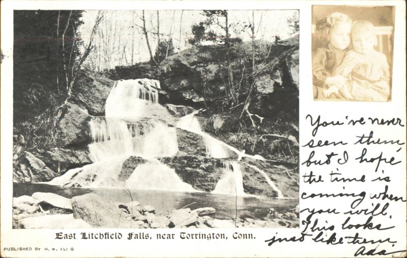 View of East Litchfield Falls with an inset photo of two young children. Includes a handwritten message from 'Ada'.