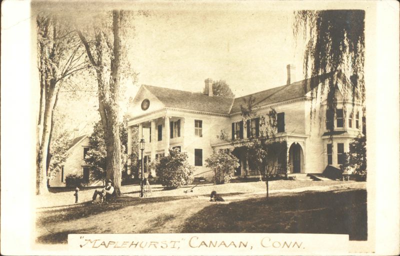 A large, multi-story house with a prominent front porch supported by columns. Large trees frame the house, and there are figures of people and a dog on the lawn.