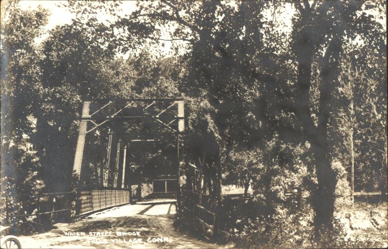Iron truss bridge spanning a dirt road, surrounded by lush trees in a rural setting.