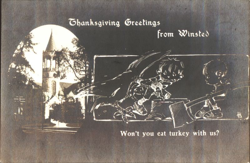 Thanksgiving Greetings Winsted Tower & Cartoon Figures