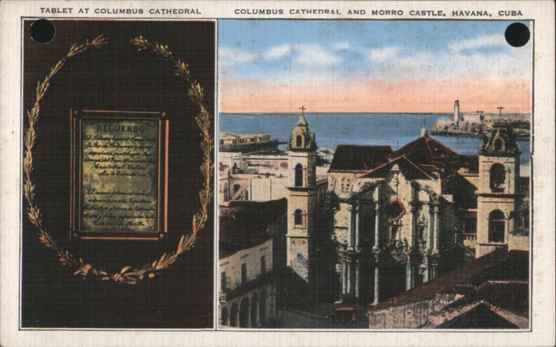 Columbus Cathedral where Christopher Columbus was buried and Morro Castle built by early military rulers of Cuba for defense against attacking pirates or enemy vessels, are two of the most interesting historical relics in Havana. Translation of inscription on tablet: IN MEMORIAM. The Government of Spain removed the ashes of the Great Admiral Don Christopher Columbus from the Republic of Santo Domingo and were deposited in this place the 19th of January, 1796. The same Government, upon cessation of its sovereignty over this Republic, removed them on the 26th of September, 1898 to the Cathedral of Seville. |