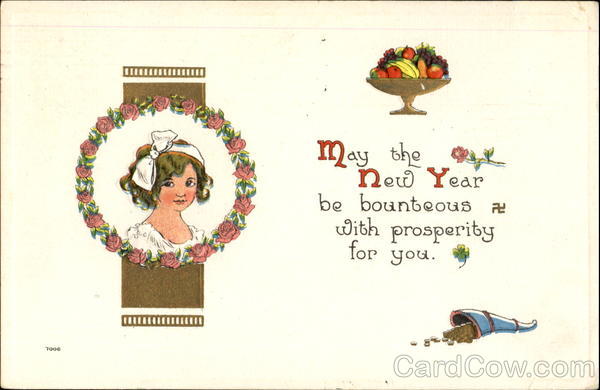 Front: 7006 May the New Year be bounteous a With prosperity for you. Back: POST ARD ERGMA Y-1913 Drai coj thank you sent. Rubvely gift I want to DEC ROMAN 1915 NAILTY N. Y AM Thiss Esthur L. Nichols Warrensbung ли