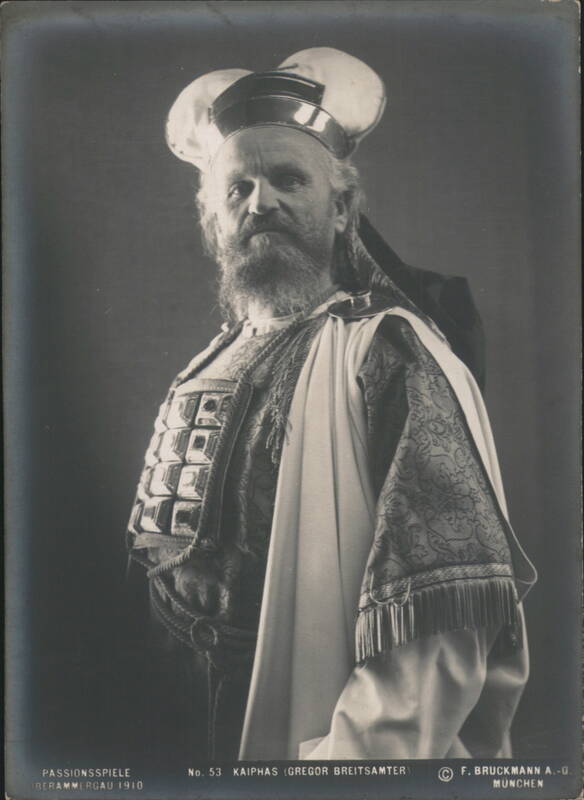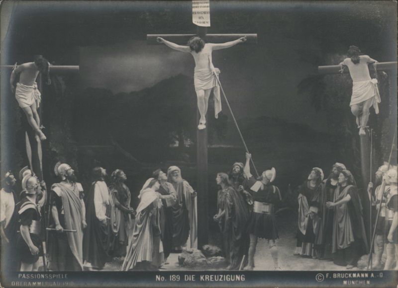 Passion Play Oberammergau 1910 - The Crucifixion A scene from the Oberammergau Passion Play of 1910, depicting the crucifixion with Jesus on the central cross, flanked by two other crucified figures. A crowd of onlookers is gathered below. Kaiphas (Gregor Breitsamter) Oberammergau Passion Play 1910 Oberammergau Passion Play 1910 - The Foot Washing RABBI ARCHELAUS (WILHELM RUTZ) Passion Play 1910 Portrait of Wilhelm Rutz as Rabbi Archelaus from the Oberammergau Passion Play of 1910. He is depicted with a beard, wearing a cap and a fringed garment. Petrus Andreas Lang as Peter in Passion Play Judas Ischariot, Johann Zwink, Oberammergau 1910 Jesus Anton Lang, Passionsspiele Oberammergau 1910 Judas' Despair in High Council, Oberammergau Passion Play The scene depicts Judas Iscariot in despair before the High Council, a moment from the 1910 Oberammergau Passion Play. JESUS UND SEINE MUTTER IN BETHANIA Oberammergau 1910 Jesus in Bethania, Passionsspiele Oberammergau 1910 A scene from the Passion Play depicting Jesus interacting with a woman, with other women standing behind her. |