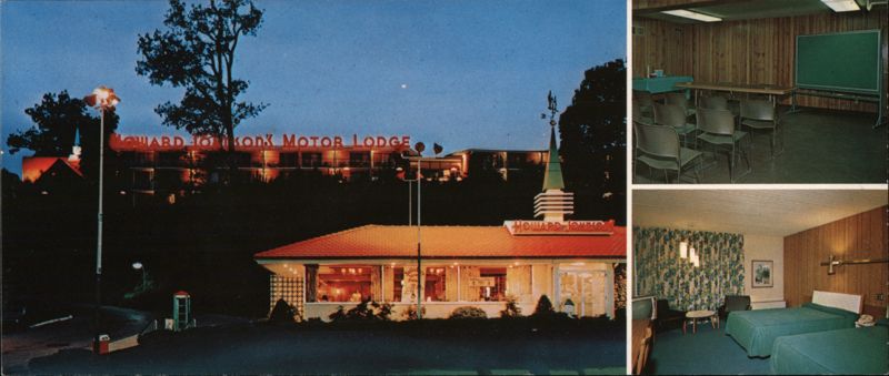 The front shows the illuminated Howard Johnson's Motor Lodge and Restaurant at night, with a distinctive weather vane. Inset images feature a conference room and a guest room with two beds.