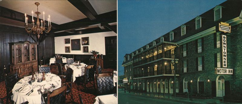 Exterior and interior view of the Rowntowner Motor Inn, featuring its Regency Dining Room, 102 units, T.V., heated pool, and lounge with prime beef.